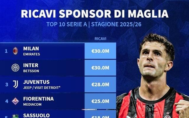意甲俱乐部球衣胸前广告赞助费TOP10:米兰双雄3000万并列第1