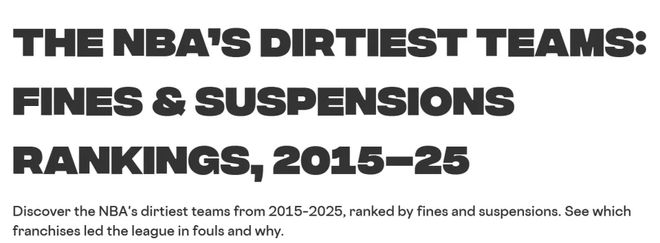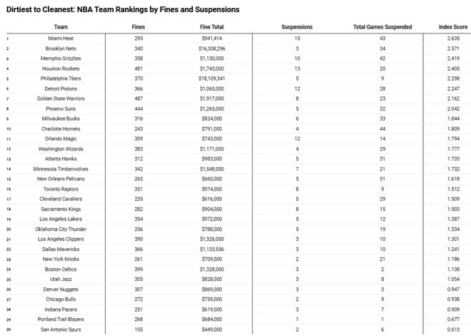 雷速体育9月17日讯 美媒rotowire借助Spotrac的NBA罚款与禁赛数据库,通过“罚款与禁赛指数”对所有球队进行了排名,揭示了过去10年里哪些球队堪称“最脏球队”。