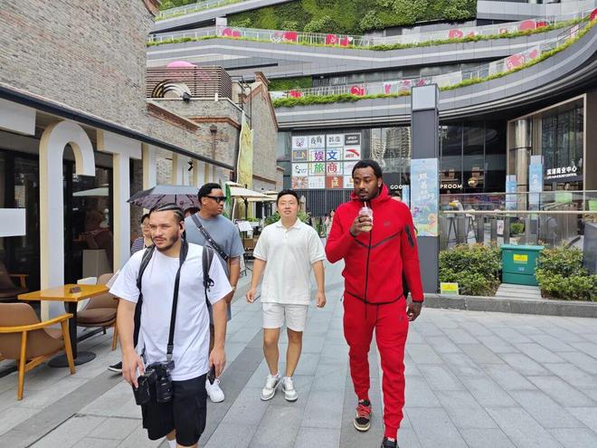 在 滨港·今潮8弄 ,身高191cm、穿着一身红色运动服的沃尔一出现就吸引了许多路人的目光。不少球迷认出了沃尔,激动地与他打招呼。