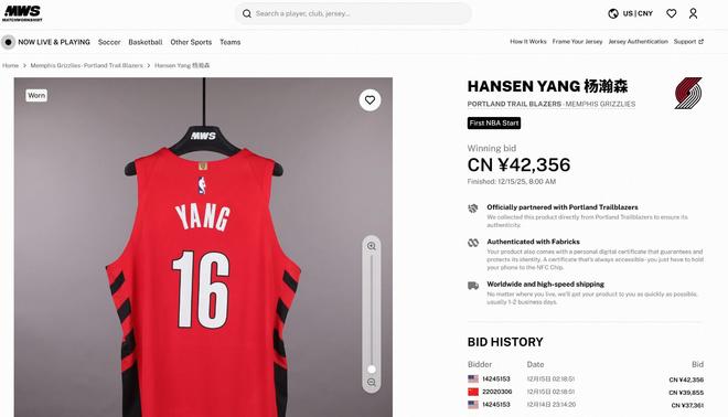 北京时间12月16日,杨瀚森在12月8日开拓者对阵灰熊的比赛中穿着的球衣在拍卖网站上成交。