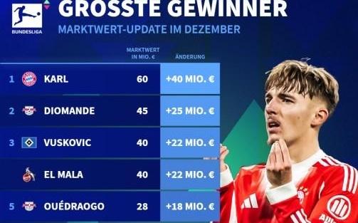 德甲身价涨幅榜:17岁小将卡尔暴涨4000万欧,赛义德马拉上涨2200万欧