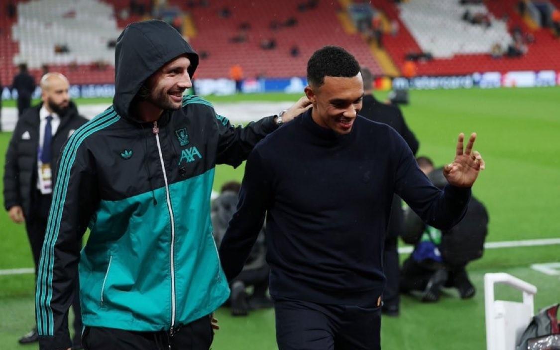 关系不错,阿诺德重返安菲尔德,和索博肩并肩走入球员通道