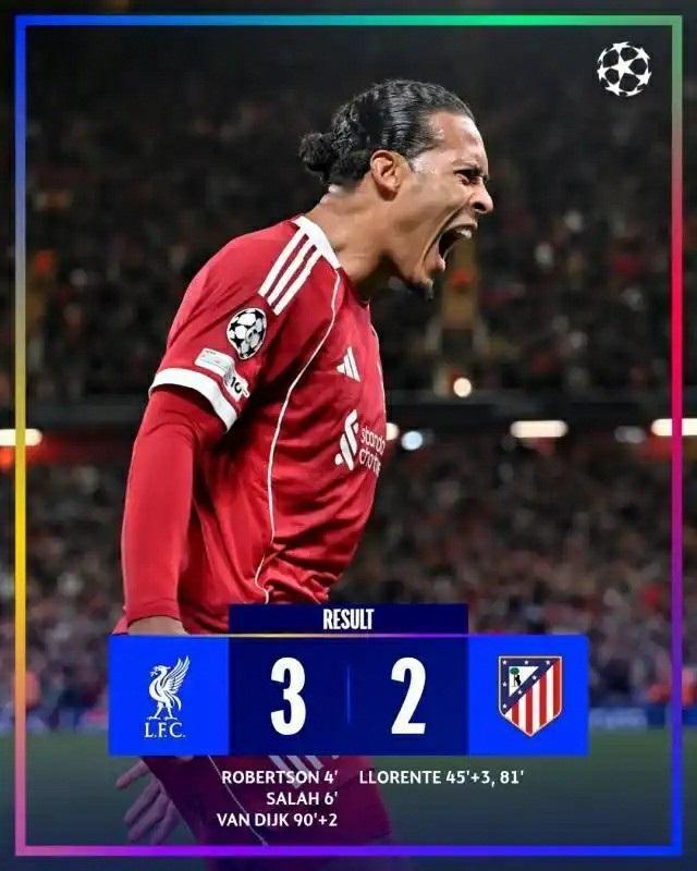 5场4绝杀!利物浦32马竞,范迪克补时绝杀+8次解围当选全场最佳