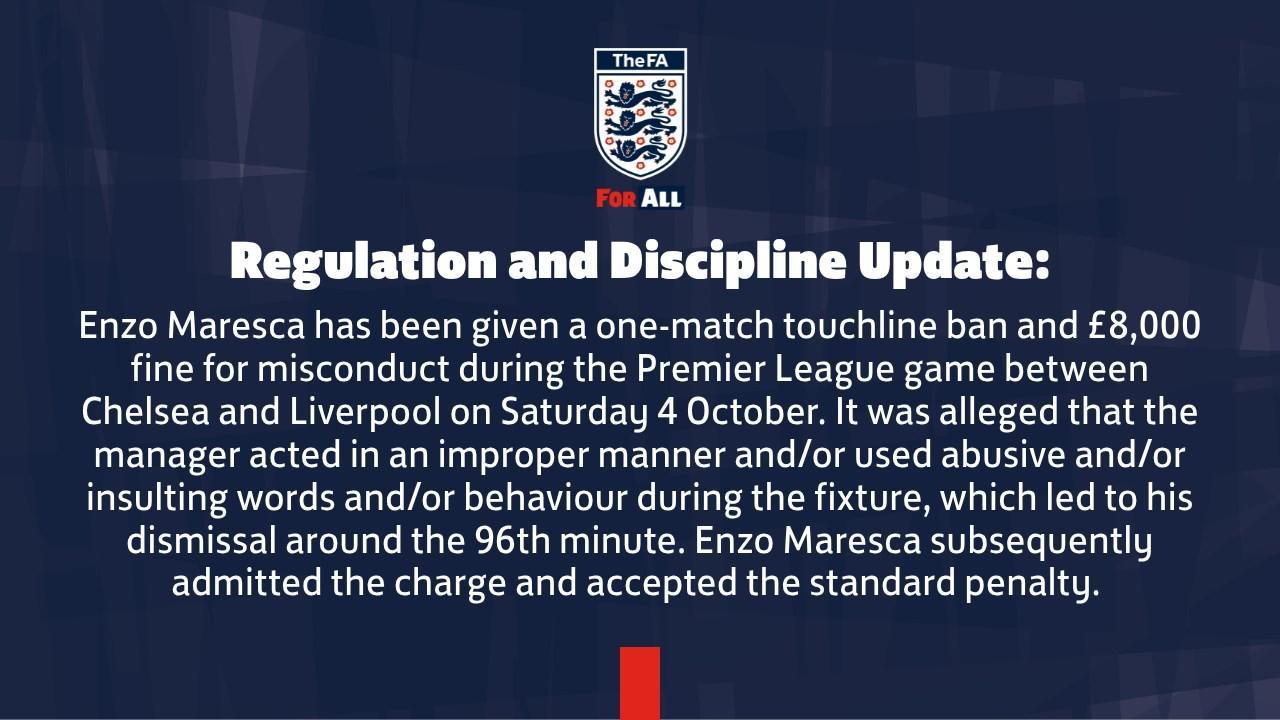 官方:马雷斯卡因对阵利物浦时染红被禁赛1场+罚款8000镑