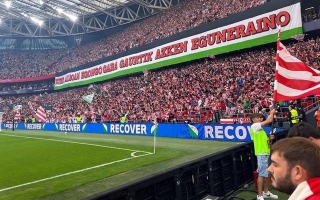 对阵阿森纳的比赛中,毕尔巴鄂球迷竞技看台打出支持巴勒斯坦横幅