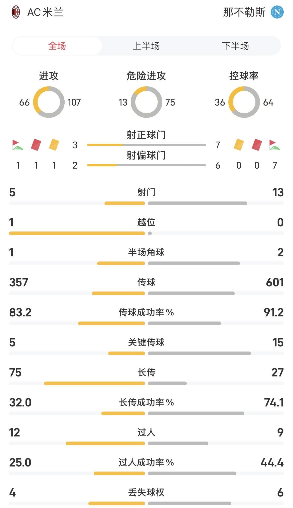 米兰vs那不勒斯全场数据:射正37,控球率36比64