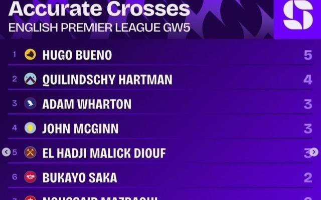 英超第5轮精准传中榜:乌戈布埃诺5次居首,哈特曼4次第二