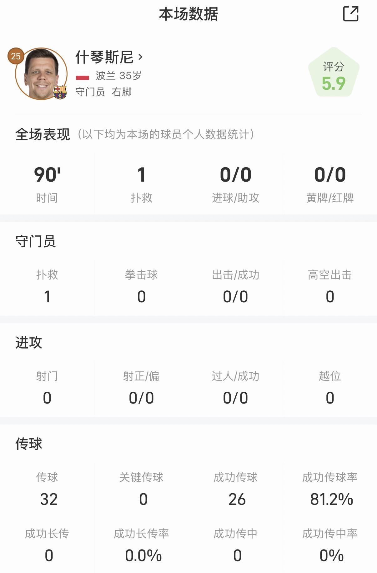 什琴斯尼全场数据:仅贡献一次扑救,传球成功率81.2%