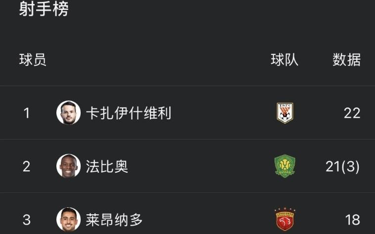中超射手榜:卡扎伊什维利22球领跑,法比奥21球紧随其后