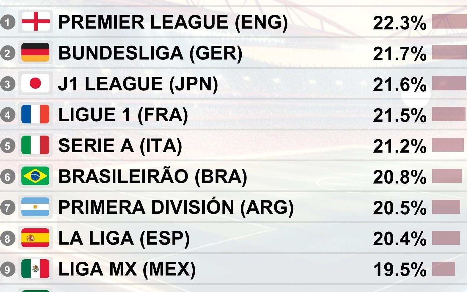各联赛高速跑动距离占比:英超居首,J1第三,西甲仅第八