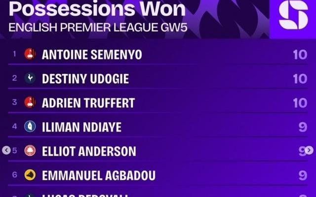 英超第5轮夺回球权榜:塞梅尼奥、乌多吉、特吕费尔10次居首