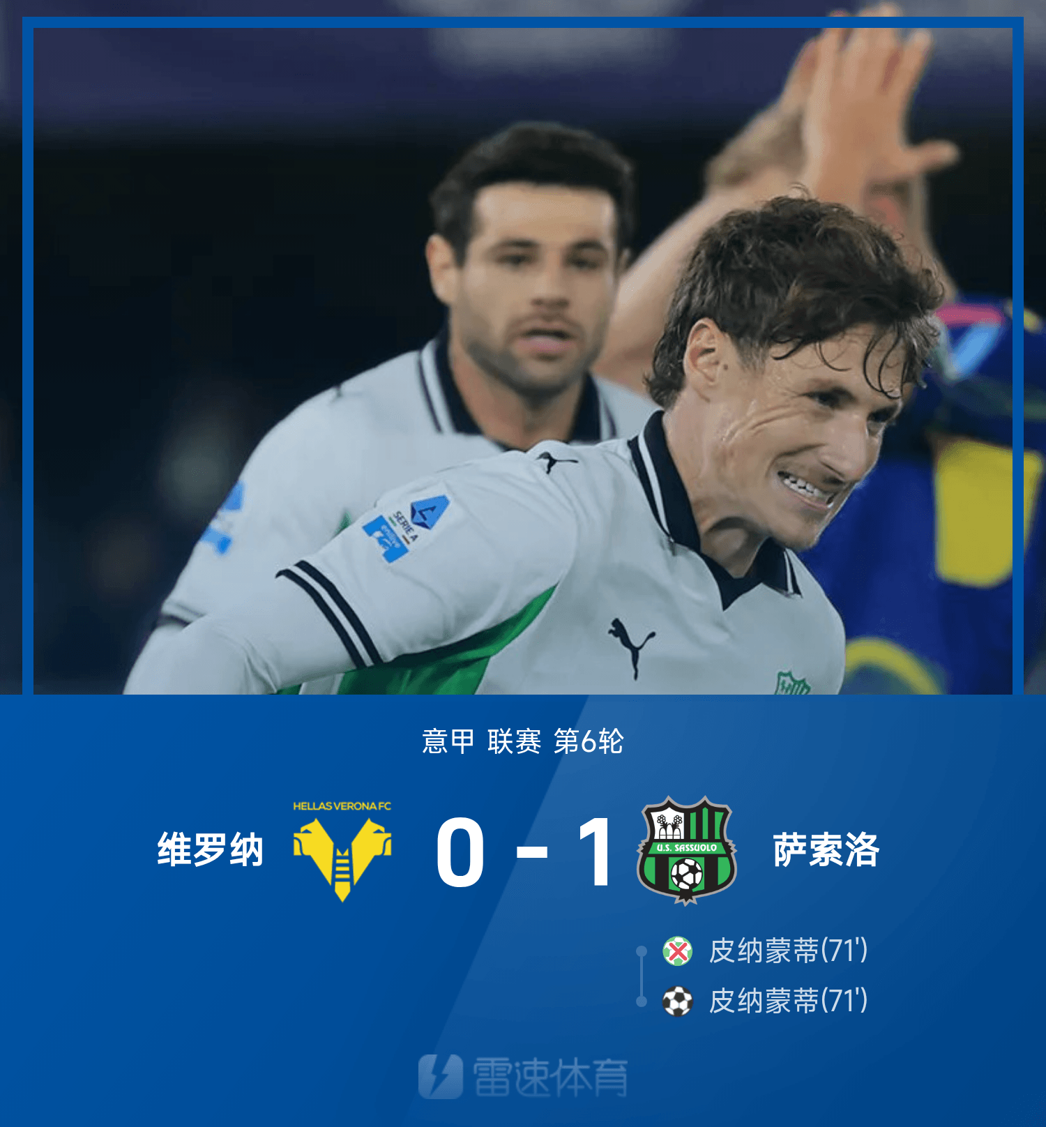 意甲战报:皮纳蒙蒂点球补射制胜,维罗纳01萨索洛
