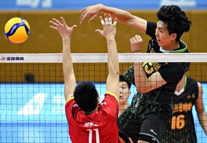 11月8日,山东队球员彭世坤(右)在比赛中扣球。 新华社记者 陈钟昊 摄