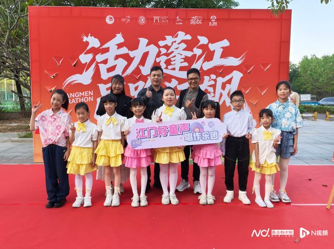 起跑后,跑者沿赛道前行,文化盛宴持续上演。元宝山体育公园内,江门好童声乐团的小歌手们唱响《母亲的臂弯》《滋味侨乡》《邑览吾遗》三首原创歌曲,稚嫩嗓音搭配融入东艺宫灯、白沙茅龙笔等非遗元素的歌词,将五邑人文风情娓娓道来,跑者们纷纷挥手致意,在旋律中感受侨乡文化的深厚底蕴。