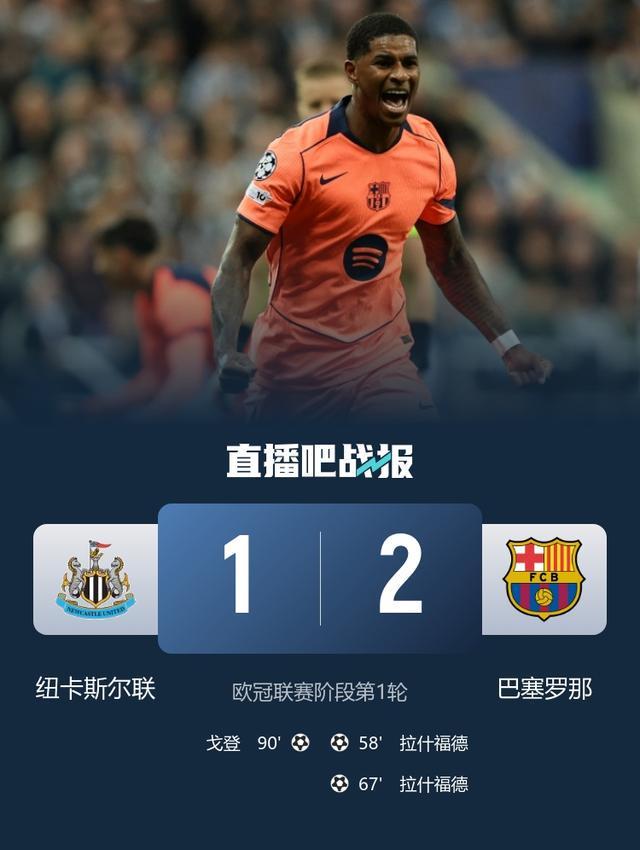 9月19日讯 北京时间9月19日凌晨3:00,欧冠联赛阶段第1轮,纽卡斯尔联队坐镇圣詹姆斯公园球场迎战巴塞罗那。上半场霍安-加西亚救险,巴萨半场1射正,暂0-0纽卡斯尔;下半场孔德助攻拉什福德破门,随后拉什福德又轰出一脚世界波,戈登扳回1球,最终巴萨2-1战胜纽卡斯尔,收获本赛季欧冠开门红。