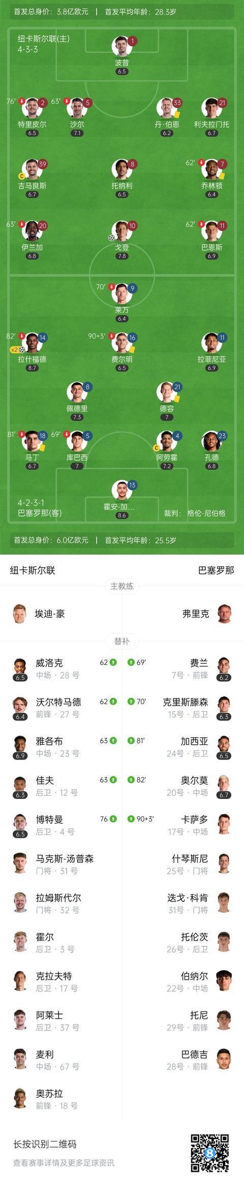 全场比赛结束,巴萨2-1纽卡斯尔。