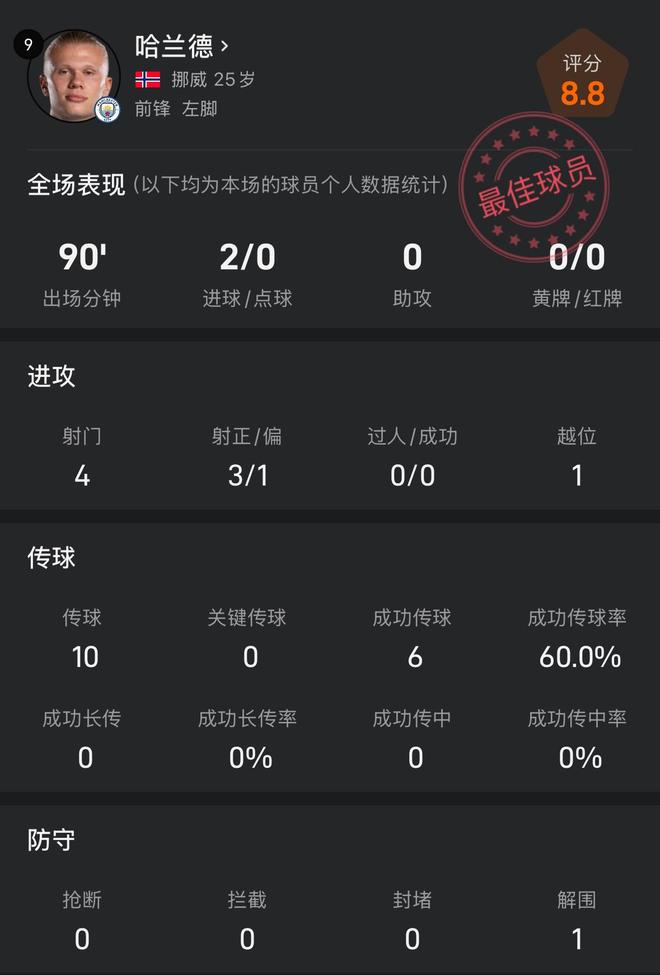 雷速体育10月2日讯 稍早前结束的欧冠联赛阶段第2轮比赛中,摩纳哥主场2-2战平曼城。本场比赛,曼城前锋哈兰德梅开二度,状态十分出色。