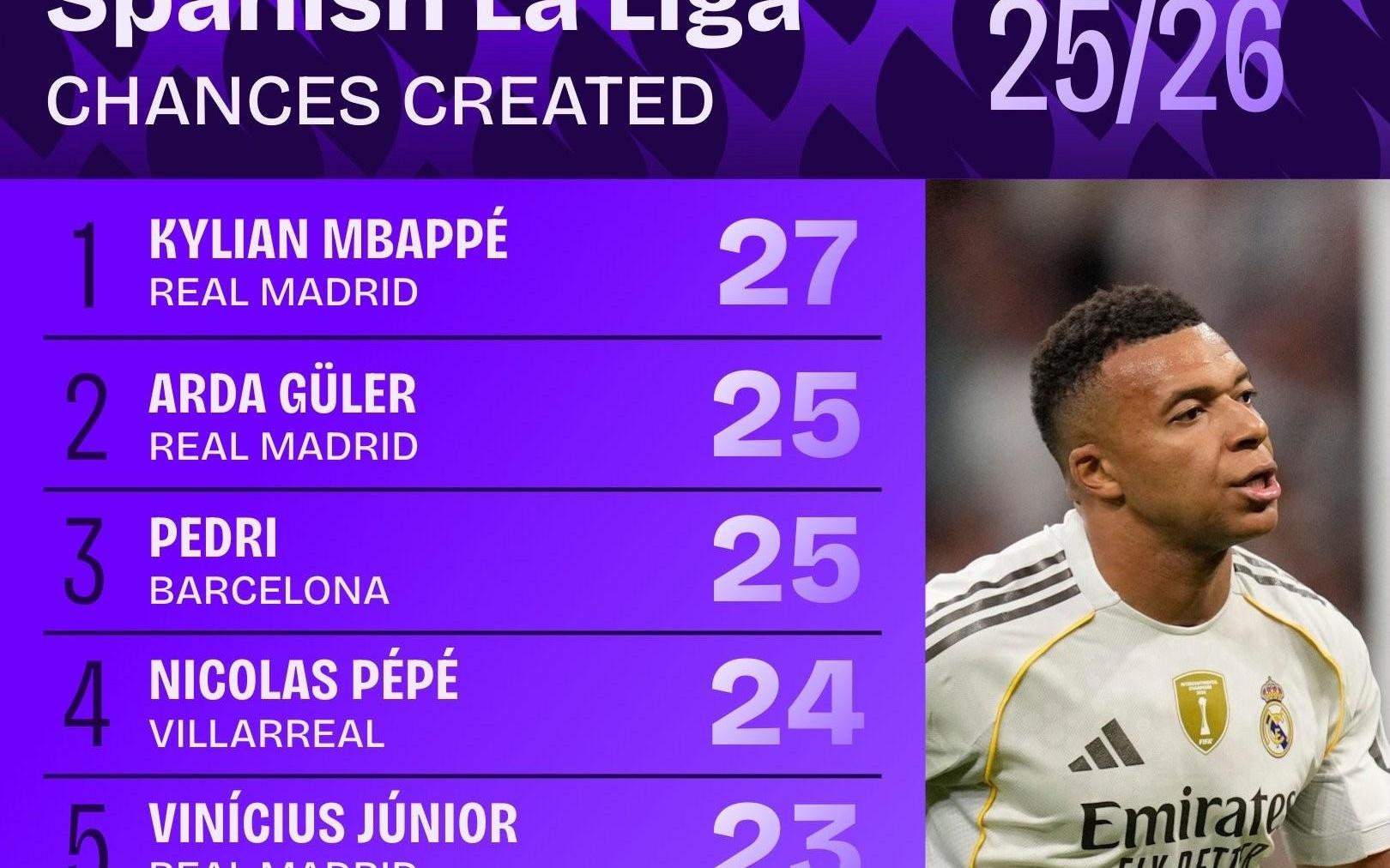本赛季西甲创造机会最多榜:姆巴佩27次,居莱尔佩德里25次第二