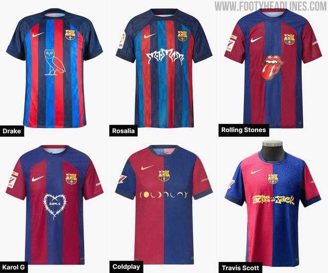 在音乐播放软件声破天赞助巴萨胸前广告后,每个赛季西甲的国家德比在球衣胸前广告与不同歌手进行合作就成了巴萨的传统之一。此前包括酷玩乐队、Drake和Travis Scott等多位大牌艺人都曾与巴萨的国家德比球衣进行过联名。