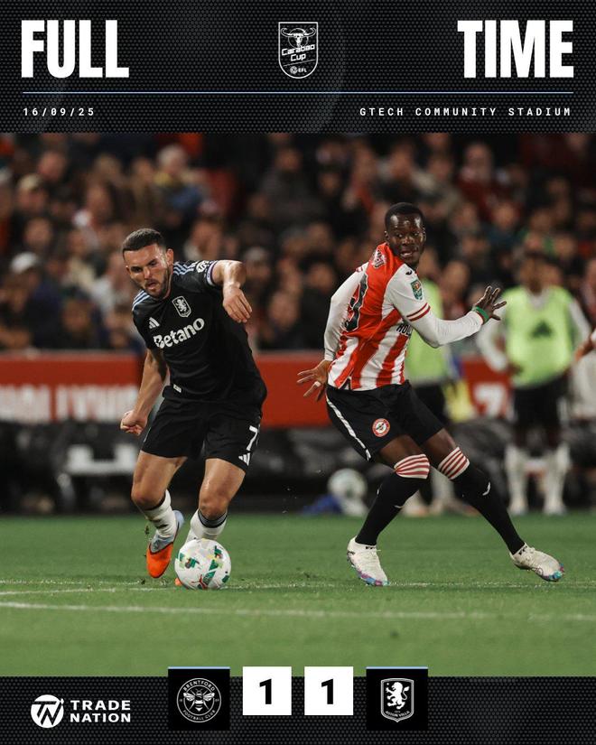雷速体育9月17日讯 在刚刚结束的英联杯第三圈比赛中,阿斯顿维拉客场1-1战平布伦特福德,点球大战中2-4不敌对手,惨遭一轮游。