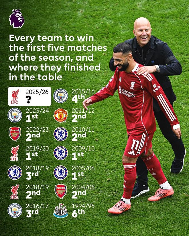 在2-1击败埃弗顿后,利物浦取得英超开局五连胜,据统计,这是英超历史上第14次有球队取得开局5连胜,此前取得开局5连胜的球队有4次最终夺冠。