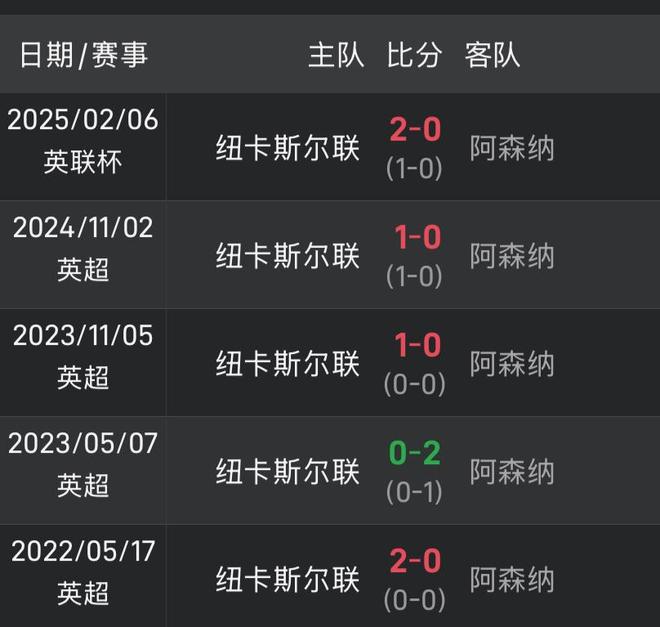 2025年2月进行的英联杯,纽卡主场2-0击败阿森纳,各项赛事主场对阵阿森纳已取得3连胜。