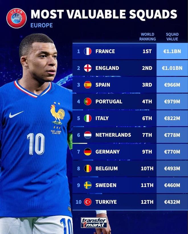 北京时间10月12日,德转统计出了欧洲国家队中目前身价排名前10的球队,法国队以11亿欧元的身价高居第一,英格兰10.1亿欧元第二,西班牙9.66亿欧元第三。